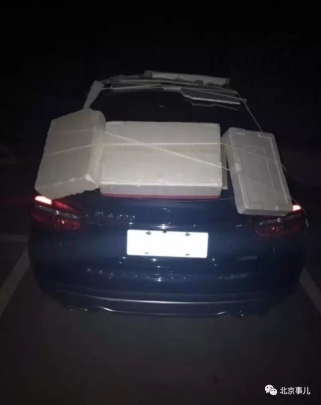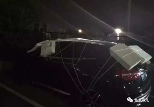 网友“五花的妈”爆料:这位车主估计是想防像昨晚的那种大暴雨和冰雹,自制了个泡沫大铠甲,捆绑技术不是一般的强啊。