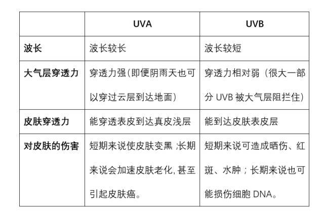 说到防晒,更准确点的说法应该是防紫外线,而对人体皮肤会造成伤害的主要是UVA和UVB两种。这里简单帮大家区分一下两者的差别: