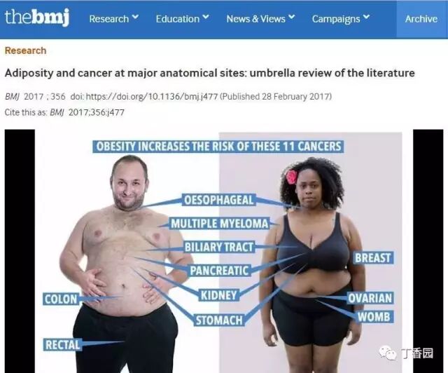 但是,The BMJ 杂志(英国医学杂志)今年年初发布了一篇重磅文章。文章证明肥胖和多达 11 种肿瘤有密切关系,肥胖可显著增加这些肿瘤的发病率。