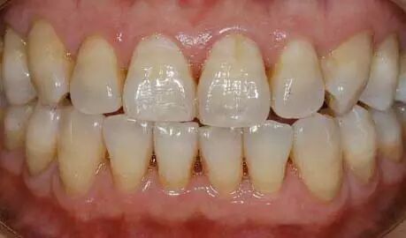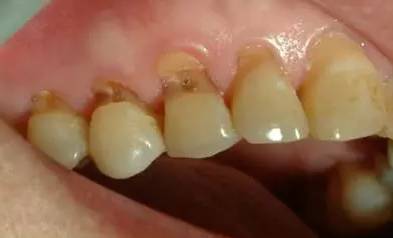 现在,请你先对照镜子,张开嘴,看看你的牙齿根部,是不是像下图一样,隐隐约约有些凹下去了?如果是,那你就得当心了!