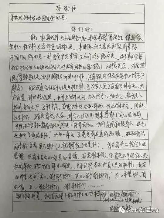 “非常感谢市妇保院医护人员,因为他们的紧急救护、无私帮助、深切关爱,我的妻子和孩子才能安然无恙。在场的妇保院的每一个人都给我留下了深刻的印象,有急人所急的保卫、便民中心工作人员及驾驶员、有专业的急救人员、有不怕脏紧紧将刚出生的满是血污的孩子一直抱在自己胸前取暖的护士等,没有他们就没有今日的欣喜!”21日,湖南籍产妇小方(化名)的丈夫廖某热泪盈眶地将一封感谢信交到市妇保院行政办公室。