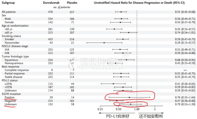 在本文讨论的这个PD-L1抗体临床试验中,研究者按照年龄、性别、是否吸烟、病理类型、PD-L1表达水平等诸多因素进行亚组分析,均发现PD-L1抗体巩固治疗强于安慰剂,而且是明显强。