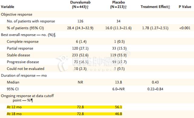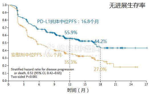 12个月、18个月时的总体生存率,也是PD-L1抗体组明显高于安慰剂组(12个月的时候,是55.9% VS 35.3%; 18个月的时候,是44.2% VS 27.0%)。