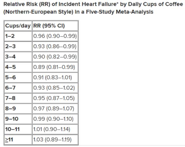 第二项2012年的Meta分析结果显示,心脏衰竭事件发生风险跟随咖啡摄入呈J型关系,拐点就在一天4-5杯。