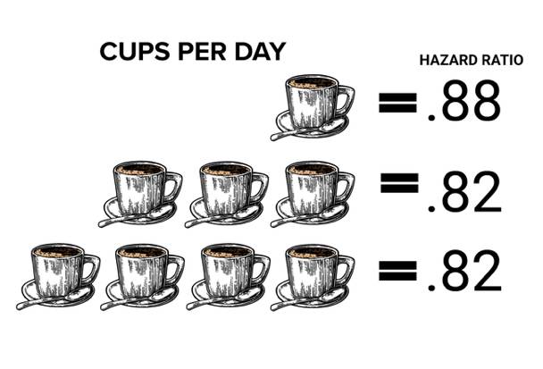 在多变量模型中,每天喝三杯以上咖啡的男性比不喝咖啡的男性全因死亡率低12%(P<0.001);女性的死亡率降低了7%(P= 0.009)。