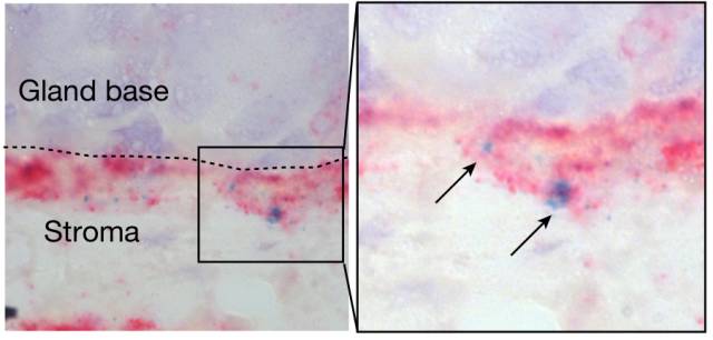 为了确定幽门螺杆菌具体是如何促进胃粘膜干细胞增殖的。Meyer博士采用单分子原位杂交技术对小鼠胃粘膜干细胞进行系统分析。结果发现,小鼠的胃粘膜下,位于胃腺基底的干细胞池中存在两种不同类型的干细胞。一种干细胞分化程度低,增殖能力强,另一种分化程度较高,增殖能力较弱。