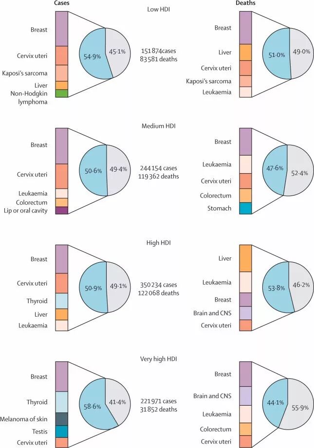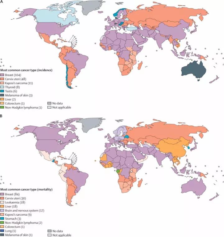 乳腺癌和子宫颈癌是大多数国家发病率和死亡率最高的癌症类型,其中,在死亡率方面,白血病、肝癌和中枢神经系统癌症是额外癌症负担。