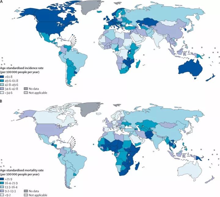 全球各国20-39岁年龄段肿瘤年龄标化总发病率(A)和总死亡率(B)