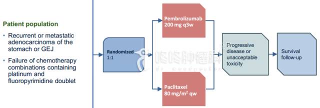 这个失败的临床试验共招募了592位铂类和5-Fu双药化疗失败的胃癌患者,接受PD-1抑制剂治疗或紫杉醇化疗。经过长期随访,进行Keytruda治疗的PD-L1阳性胃癌患者与化疗组患者相比,在总生存期和无进展生存期方面都没有提高,临床试验失败。