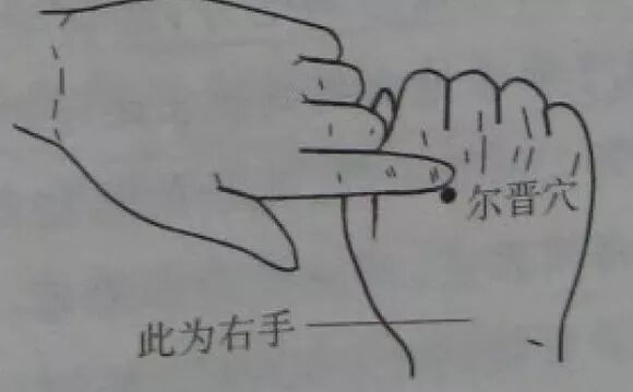 手背第二、三手指掌骨间、掌指关节后一横指处(即落枕穴后)有一治疗晕车(船)的特效穴,即尔晋穴。