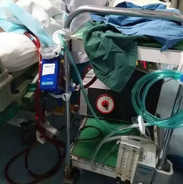 三次除颤后,明老师仍顽固性心律失常,在呼吸机的辅助呼吸下,血氧持续波动在40%-60%,生命体征微弱。