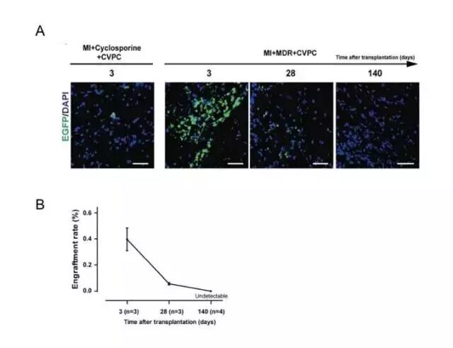 人胚胎干细胞衍生心血管前体细胞(hESCS-CVPCs)在非人灵长类心脏组织中存留。图为不同免疫抑制剂方案组中,移植细胞存留情况(A)以及在联合免疫抑制剂细胞移植组(MI+MDR+CVPC)中不同时间点细胞存留情况。