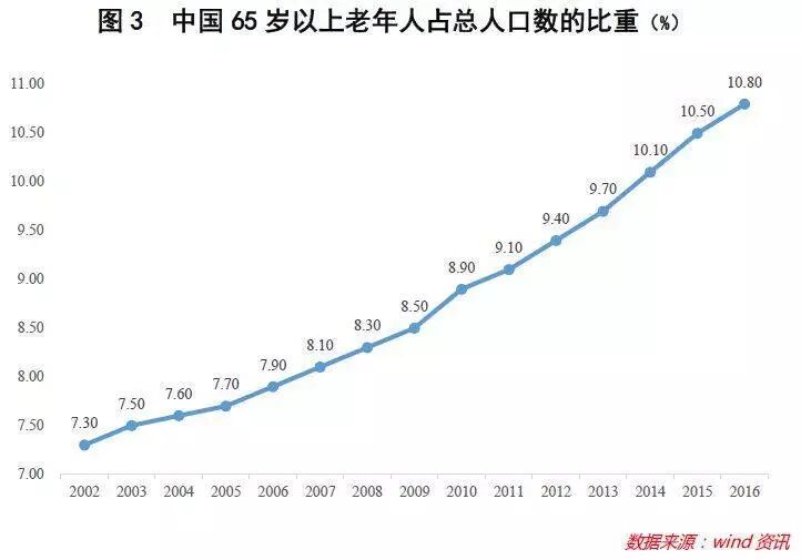 与此同时,我们所处的社会正呈现出日渐严重的老龄化态势。其实,早在本世纪伊始,我国人口结构就已经具备了老龄化社会的特征,即65岁以上的老人所占比重超过7%;而后,这一比重更是节节攀升,2016年已然达到10.8%,也就是说,每100个中国人里,就有11个65岁以上的老人(详见图3)。