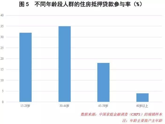 此外,在负债人群中,年轻人占据绝对主力地位。参与负债的城市家庭年龄大体上呈驼峰分布,其中大部分都是年轻家庭,而30岁以下的年轻家庭的负债参与率与30~44岁中年人群的负债参与率接近,也远高于其他年龄群体(详见图5)。