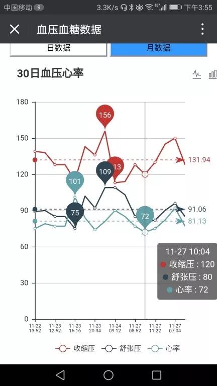 可同时测量血压、血糖、脉搏,测量后的数据将会通过机器绑定的移动物联网卡将数据传送致后台,经过分析处理保存在数据库中。用户可以在公众号内“我的”-“健康数据”内查看到曾经测量的历史数据。该数据永久保存,用户不仅可以在系统中查看到当天测量的数据,并且将7天、30天内的数据以折线图的形式展示给大家,让用户对自己的血压、血糖、脉搏的数据变化一目了然,用户还可以自己指定日期,查看有记录以来的某一天的数据。对慢性病人的长期监测非常有意义。