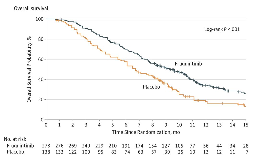 所有患者以2:1的比例,随机分成2组,试验组278名患者,接受口服Fruquintinib治疗,另外138名患者接受安慰剂治疗,两组均联合最好的支持治疗。